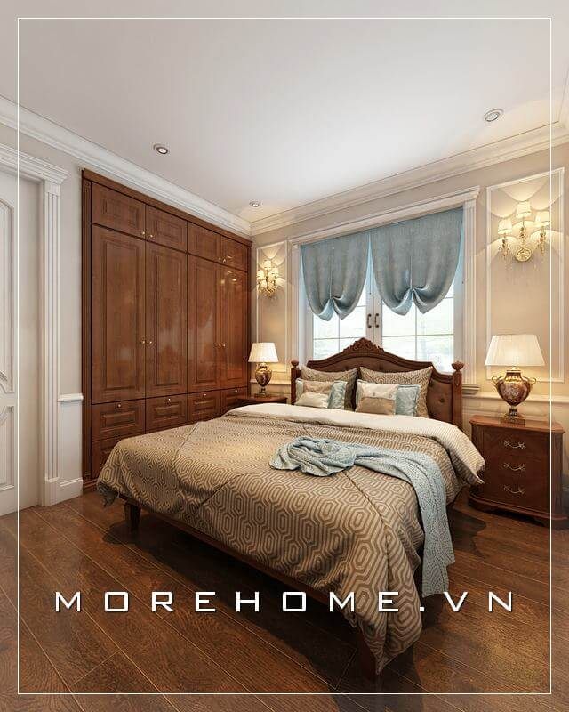 Nội thất phòng ngủ chung cư tân cổ điển sang trọng, chất liệu gỗ tự nhiên được lựa chọn xuyên suốt không gian mang lại cảm giác ấm cúng và chắc chắn hơn cho gia chủ trong quá trình sử dụng