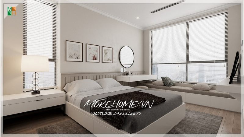 Nội thất phòng ngủ chung cư hiện đại, bàn học nối liền tap đầu giường cùng tone màu tạo nên sự liền mạch cho cả không gian phòng ngủ